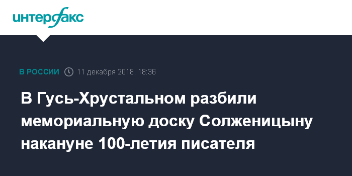 Москва. 11 декабря. INTERFAX.RU - Полиция проводит проверку по факту повреждения в Гусь-Хрустальном районе Владимирской области мемориальной доски Александру Солженицыну, 100-летие которого отмечают во вторник.