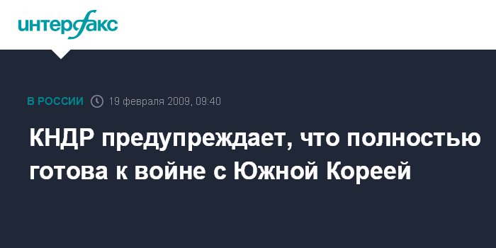 Москва. 19 февраля. INTERFAX.RU - Армия КНДР заявляет, что полностью готова к возможной войне с Южной Кореей, сообщают в четверг сеульские СМИ со ссылкой на распространенное в Пхеньяне заявление представителя северокорейского командования.