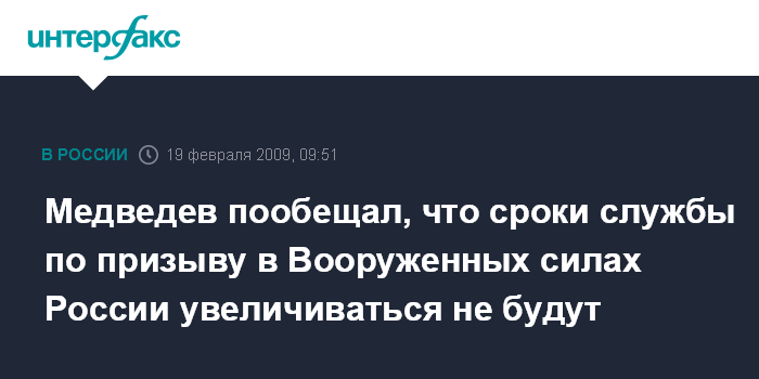 Москва. 19 февраля. INTERFAX.RU - Сроки срочной службы в Вооруженных силах РФ увеличиваться не будут, заявил президент РФ Дмитрий Медведев.
