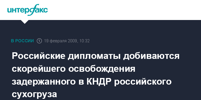 Москва. 19 февраля. INTERFAX.RU - МИД России и посольство РФ в Пхеньяне предпринимают все возможные усилия для скорейшего освобождения задержанного в КНДР российского сухогруза "Омский-122". "Мы вплотную занимается этим вопросом. МИД России через российское посольство в Пхеньяне использует все возможности и выходы на местные власти с тем, чтобы как можно быстрее освободить судно", - заявили "Интерфаксу" в четверг в Департаменте информации и печати МИД РФ.