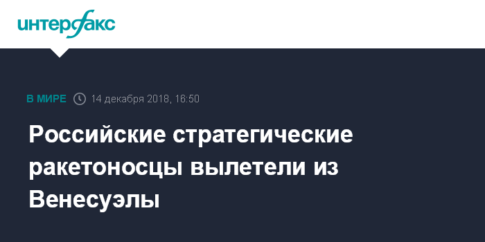Москва. 14 декабря. INTERFAX.RU - Два стратегических бомбардировщика Ту-160 ВКС РФ в пятницу вылетели из Венесуэлы, взяв курс на базу в России, следует из мониторинговых данных западных авиационных ресурсов.