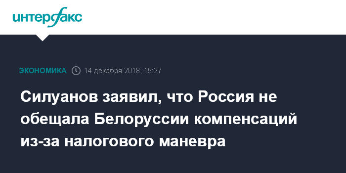 "Россия не давала Белоруссии какие-либо обещания по выплате компенсаций за изменения налогового законодательства в России. Считаем такие изменения, в том числе налоговый маневр в нефтегазовой отрасли, внутренним делом РФ", - заявил журналистам в пятницу вечером первый вице-премьер - министр финансов России Антон Силуанов.
