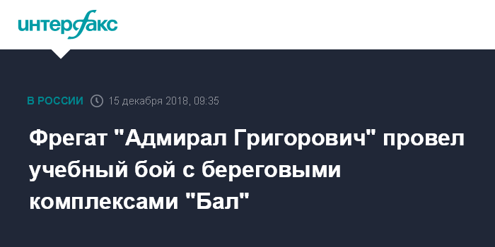 Москва. 15 декабря. INTERFAX.RU - Экипаж фрегата "Адмирал Григорович" и личный состав боевых расчетов мобильных береговых противокорабельных ракетных комплексов "Бал" провели совместное учение в ходе боевой подготовки Черноморского флота, сообщил агентству "Интерфакс" начальник отдела информационного обеспечения Черноморского флота Алексей Рулев.