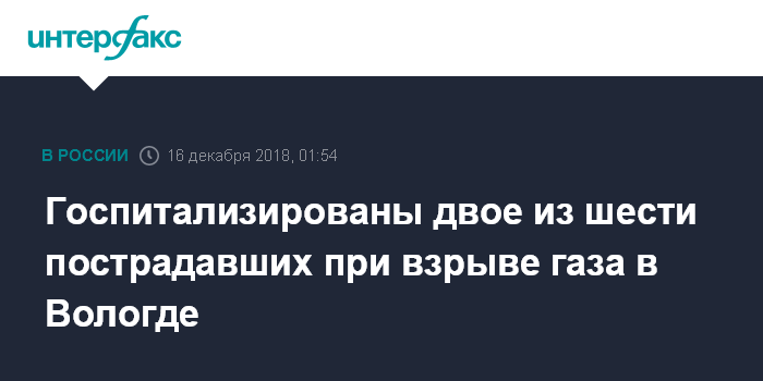 Москва. 16 декабря. INTERFAX.RU - Госпитализация понадобилась двум из шести пострадавших при взрыве бытового газа в квартире жилого дома в Вологде, сообщили "Интерфаксу" в пресс-службе областного ГУ МЧС.