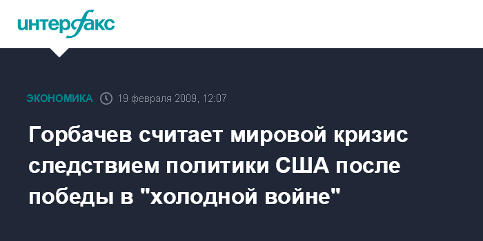 При этом Горбачев высказал мнение, что нынешняя ситуация является "кризисом той политики, которую продавливала Америка". В частности, бывший советский лидер выразил сожаление, что когда кризис стал намечаться, "не у дел оказались международные институты - ООН, Мировой банк, Международный валютный фонд". "Они находились под контролем (подразумевается США - ИФ)", - пояснил свою мысль Горбачев. При этом он высказал мнение, что США проводили такую политику из-за того, что посчитали себя победителем в "холодной войне". "Комплекс победителя - это страшная болезнь, и они еще не вышли из этого комплекса", - сказал Горбачев.