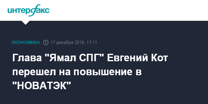 Москва. 17 декабря. INTERFAX.RU - Совет директоров "НОВАТЭКа" избрал главу "Ямал СПГ" Евгения Кота заместителем председателя правления - директором по СПГ, начиная с 14 января 2019 года, сообщил "НОВАТЭК" .