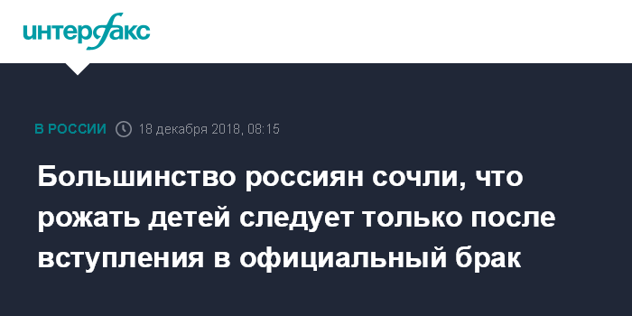 Москва. 18 декабря. INTERFAX.RU - Почти две трети россиян придерживаются мнения, что если люди хотят иметь детей, то им нужно оформить свои отношения, свидетельствуют данные опроса "Левада-центра", поступившие в "Интерфакс".