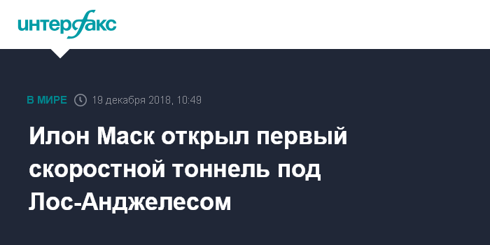 Москва. 19 декабря. INTERFAX.RU - Основатель SpaceX и Tesla Илон Маск открыл скоростной подземный тоннель под Лос-Анджелесом. Презентация для журналистов и вип-гостей прошла во вторник вечером.
