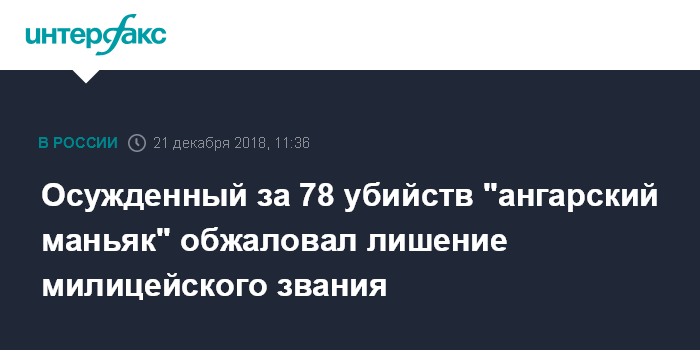 Кроме того, по его словам, "ангарский маньяк" не согласен с тем, что его признали виновным в нескольких первых убийствах, поскольку по ним истек срок исковой давности.