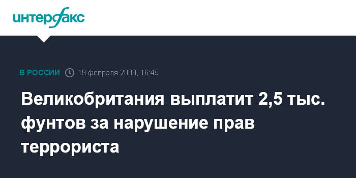 Лондон. 19 февраля. INTERFAX.RU - Европейский суд по правам человека (ЕСПЧ) вынес решение о выплате компенсации на сумму 2,5 тыс. фунтов стерлингов радикальному проповеднику Абу Катаде, обвиняемому в ряде стран в подготовке террористических актов, сообщает в четверг BBC.