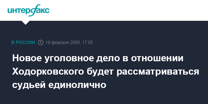 Москва. 19 февраля. INTERFAX.RU - Новое уголовное дело в отношении бывших совладельцев НК ЮКОС Михаила Ходорковского и Платона Лебедева будет рассматриваться единолично судьей Хамовнического районного суда Москвы. Об этом сообщает пресс-центр адвокатов Ходорковского и Лебедева со ссылкой на Хамовнический суд столицы.