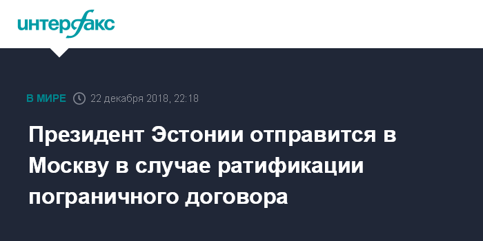 Москва. 22 декабря. INTERFAX.RU - Президент Эстонии Керсти Кальюлайд (Kersti Kaljulaid) готова отправиться в Россию в случае, если в Москве будет ратифицирован двусторонний пограничный договор.