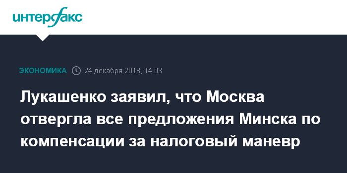 Москва. 24 декабря. INTERFAX.RU - Президент Белоруссии Александр Лукашенко заявляет, что Москва отвергла все предложения Минска по ценам на газ и по компенсации за налоговый маневр в нефтедобывающей отрасли.