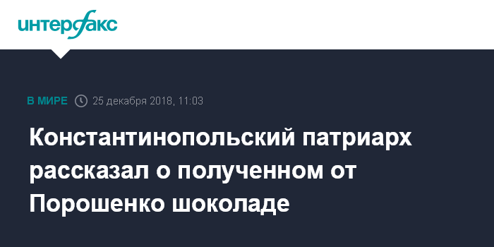 По словам патриарха Варфоломея, Петр Порошенко направил ему угощения со своей фабрики "от великой радости, что стране удалось достичь автокефалии".