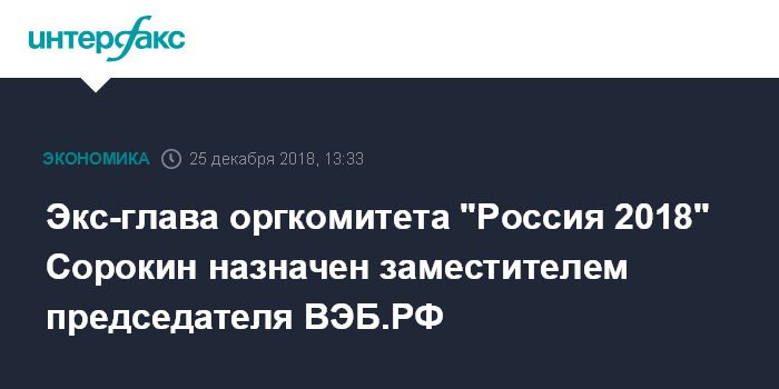 Москва. 25 декабря. INTERFAX.RU - Бывший генеральный директор оргкомитета "Россия 2018" Алексей Сорокин стал заместителем председателя ВЭБ.РФ, сообщает пресс-служба организации.