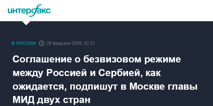 Москва. 20 февраля. ИНТЕРФАКС - Соглашение о взаимных безвизовых поездках для граждан России и Сербии будет, как ожидается, подписано в пятницу в Москве.