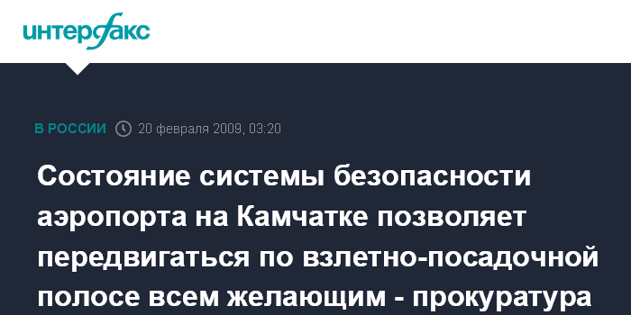 Петропавловск-Камчатский. 20 февраля. ИНТЕРФАКС-ДАЛЬНИЙ ВОСТОК - Аэропорт Петропавловска-Камчатского оказался не защищенным от террористов и хулиганов, сообщили агентству "Интерфакс-Дальний Восток" в пятницу в камчатской транспортной прокуратуре.