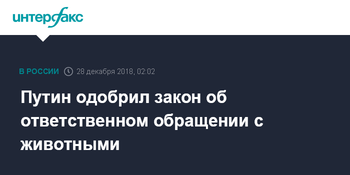 Москва. 27 декабря. INTERFAX.RU - Президент России Владимир Путин подписал закон об ответственном обращении с животными, следует из соответствующего документа на официальном интернет-портале правовой информации.