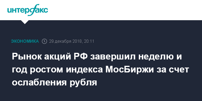 Москва. 29 декабря. INTERFAX.RU - Рынок акций РФ завершил последнюю торговую неделю декабря и весь 2018 год ростом индекса МосБиржи за счет ослабления рубля; лидерами роста в субботу выступили "префы" "Транснефти" .