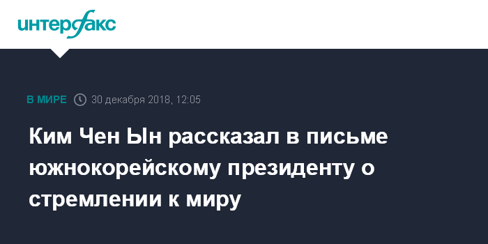Москва. 30 декабря. INTERFAX.RU - Лидер КНДР Ким Чен Ын отправил письмо президенту Южной Кореи Мун Чжэ Ину, в котором выразил намерение продолжать идти по пути становления мира на Корейском полуострове, сообщает в воскресенье агентство "Ренхап".