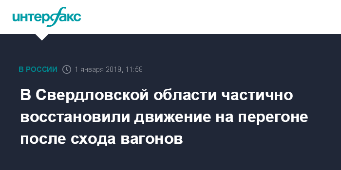 Москва. 1 января. INTERFAX.RU - Движение на перегоне Храмцовская - Марамзино Свердловской железной дороги, нарушенное утром во вторник после схода вагонов с углем, открыто по одному пути, сообщает пресс-служба СВЖД.