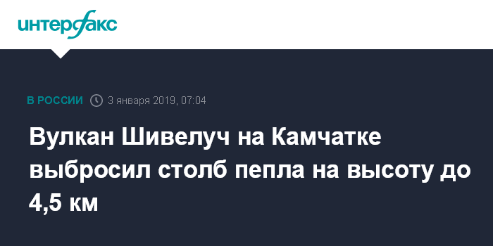 Москва. 3 января. INTERFAX.RU - Вулкан Шивелуч на Камчатке в четверг выбросил столб пепла на высоту до 4,5 км над уровнем моря, сообщает Главное управление МЧС России по Камчатскому краю.
