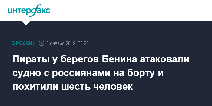 Москва. 5 января. INTERFAX.RU - Пираты атаковали грузовое судно у берегов Бенина в ночь на 2 января и захватили шесть членов экипажа, сообщили "Интерфаксу" в ночь на субботу в посольстве России в Бенине.