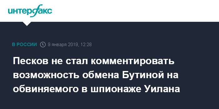 Москва. 9 января. INTERFAX.RU - Пресс-секретарь президента РФ Дмитрий Песков оставил без комментариев высказывания о возможном обмене россиянки Марии Бутиной на американца Пола Уилана, который обвиняется в шпионаже.