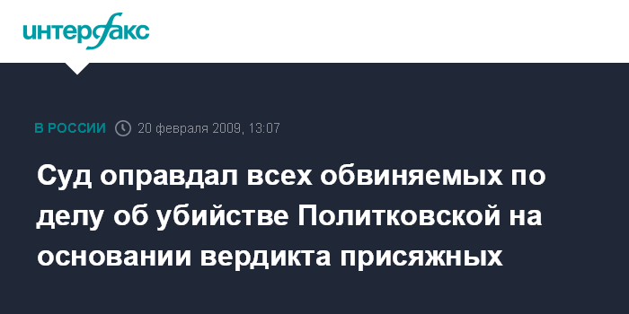 Москва. 20 февраля. INTERFAX.RU - Московский окружной военный суд, руководствуясь вердиктом присяжных, оправдал обвиняемых по делу об убийстве обозревателя "Новой газеты" Анны Политковской.