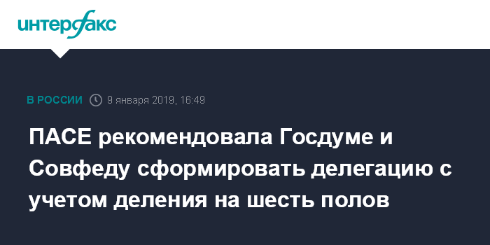 Москва. 9 января. INTERFAX.RU - Одной из рекомендаций Парламентской ассамблеи Совета Европы (ПАСЕ) по формированию российской делегации стало деление ее потенциальных участников на шесть полов, заявил вице-спикер Госдумы Петр Толстой.