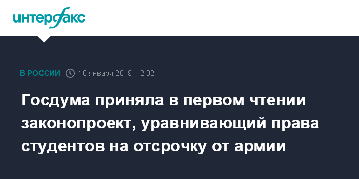 Москва. 10 января. INTERFAX.RU - Госдума в четверг приняла в первом чтении законопроект, позволяющий получить две отсрочки от армии в период обучения в вузе.
