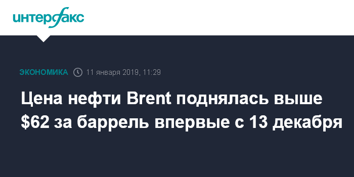 Цена нефти Brent поднялась выше $62 за баррель впервые с 13 декабря