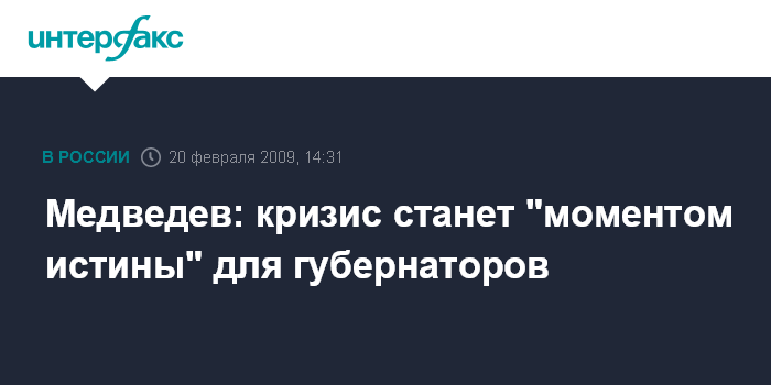 Москва. 20 февраля. INTERFAX.RU - Скидок на кризис при оценке деятельности губернаторов делаться не будет, заявил президент РФ Дмитрий Медведев. "Это и "момент истины" для самого губернаторского корпуса. Это абсолютно точно. Надеюсь, что вы это понимаете", - сказал глава государства, обращаясь к губернаторам с заключительным словом на заседании президиуме Госсовета. "Ведь никакого снисхождения быть не может", - подчеркнул он.