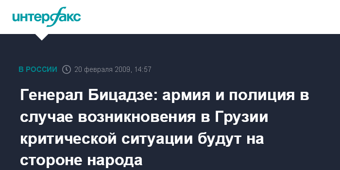 Москва. 20 февраля. INTERFAX.RU - Экс-глава пограничной полиции Грузии, генерал Бадри Бицадзе уверен, что в случае противостояния народа и власти грузинские армия и полиция будут на стороне народа. "На протяжении многих лет я работал в различных силовых органах и имею информацию практически из всех ведомств о положении в них. Я знаю, что в критический момент они встанут рядом с народом. Поэтому, власти пусть зря не пугают население полицией и армией", - заявил он в интервью грузинской газете "Ахали Таоба".