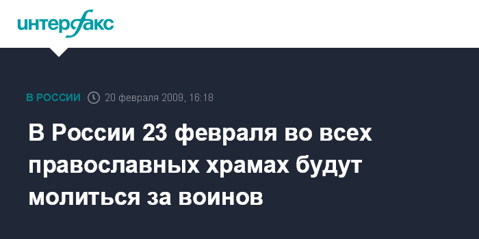 Москва. 20 февраля. INTERFAX.RU - В День защитника Отечества во всех храмах Русской православной церкви будет возноситься молитва за воинов, сообщил управляющий Московской епархией митрополит Крутицкий и Коломенский Ювеналий.
