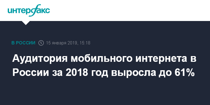 Москва. 15 января. INTERFAX.RU - Доля пользователей мобильного интернета в России по итогам 2018 года составила 61% против 56% годом ранее, свидетельствуют результаты исследования GfK.