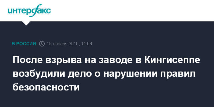 Москва. 16 января. INTERFAX.RU - Уголовное дело о нарушении правил безопасности на опасных объектах возбуждено после взрыва на заводе "Полипласт" в Ленинградской области, сообщили в пресс-службе СК РФ.
