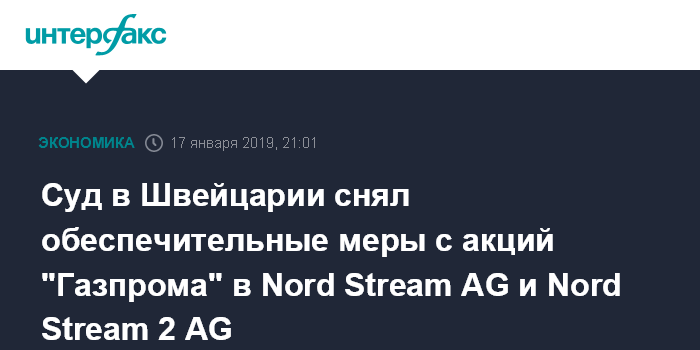 Москва. 17 января. INTERFAX.RU - Суд кантона Цуг (Швейцария) 16 января принял решение полностью отменить свое постановление, вынесенное 29 мая 2018 года, о наложении в Швейцарии обеспечительных мер на акции "Газпрома" в Nord Stream AG и Nord Stream 2 AG и на права требования "Газпрома" к этим компаниям.