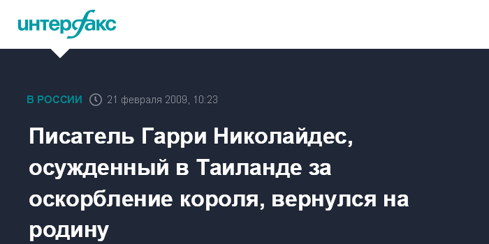 Лондон. 21 февраля. INTERFAX.RU - Австралийский писатель Гарри Николайдес, отбывавший в Таиланде тюремный срок за оскорбление монархии, был оправдан королем, освобожден и уже вернулся домой, сообщает британская телерадиокорпорация Би-би-си.