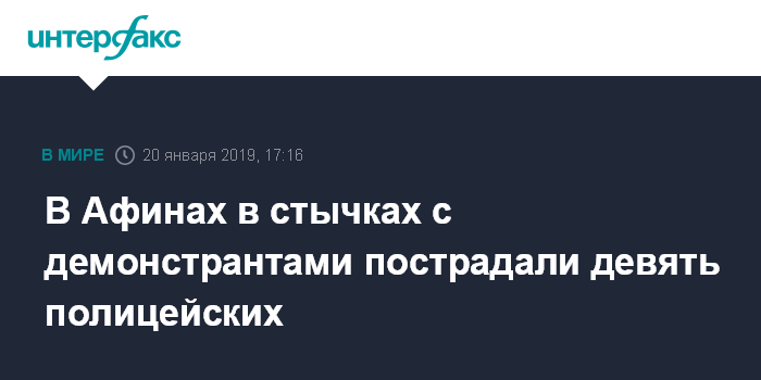 Москва. 20 января. INTERFAX.RU - Между полицией и гражданами, участвующими в Афинах в протестах против соглашения с Македонией, произошли столкновения, сообщает в воскресенье агентство Associated Press.