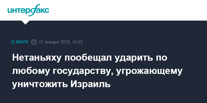 Москва. 21 января. INTERFAX.RU - Премьер-министр Израиля Биньямин Нетаньяху в понедельник заявил о готовности Израиля ударить по любой стране, из которой будет исходить угроза для Израиля, пишет The Jerusalem Post.