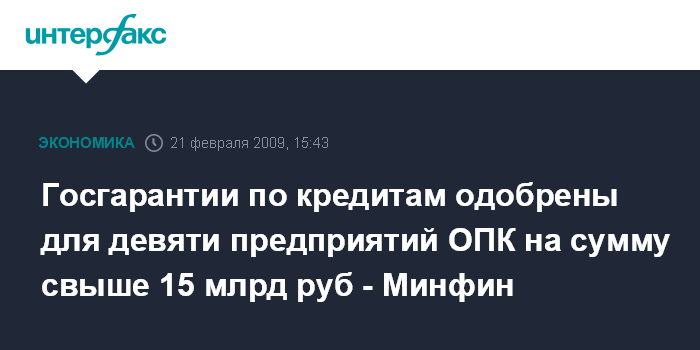 Москва. 21 февраля. INTERFAX.RU - Межведомственная комиссия по вопросам поддержки предприятий оборонного комплекса приняла решение о предоставлении государственных гарантий по кредитам девяти предприятиям на сумму свыше 15 млрд рублей, сообщил заместитель министра финансов Антон Силуанов журналистам в субботу.