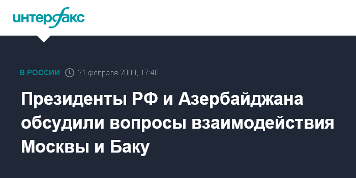 Москва. 21 февраля. INTERFAX.RU - Президенты России и Азербайджана Дмитрий Медведев и Ильхам Алиев обсудили в субботу по телефону вопросы развития отношений двух стран и нагорно-карабахского урегулирования.