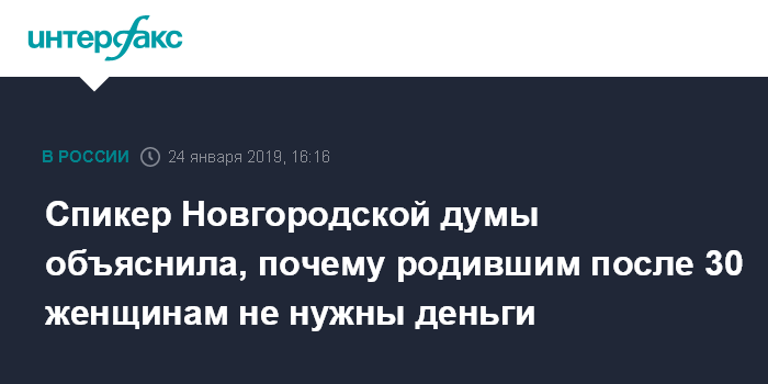 Москва. 24 января. INTERFAX.RU - Председатель Новгородской областной думы Елена Писарева объяснила свои слова, касающиеся материальной поддержки женщин после 30 лет.