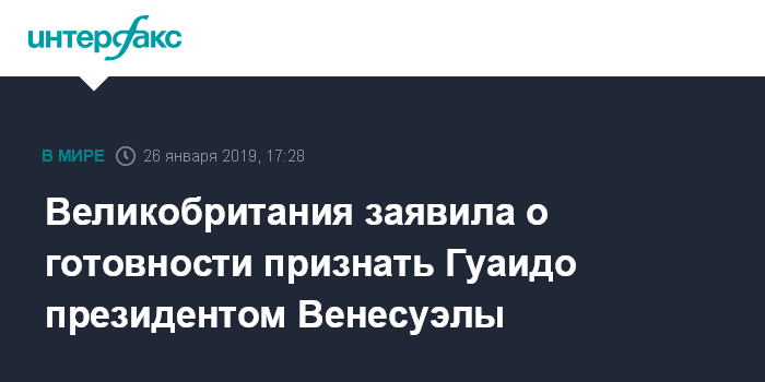 Москва. 26 января. INTERFAX.RU - Глава МИД Британии Джереми Хант в субботу заявил о готовности Лондона признать Хуана Гуаидо временным президентом Венесуэлы, если в стране в течение восьми дней не объявят о проведении выборов.