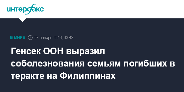 Москва. 28 января. INTERFAX.RU - Генеральный секретарь ООН Антониу Гутерриш осудил совершенный в воскресенье теракт на Филиппинах и выразил соболезнования семьям погибших.