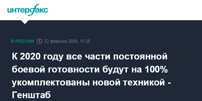 "Планируем, что к 2020 году по частям постоянной боевой готовности у нас будет до 100 процентов новой техники и вооружения, в остальных - не менее 70 процентов", - сказал журналистам на открывшейся в воскресенье в Объединенных Арабских Эмиратах оружейной выставке "АЙДЕКС-2009" начальник Генерального штаба генерал армии Николай Макаров.