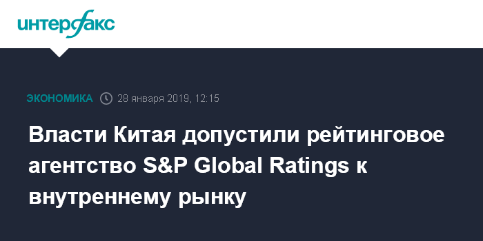 Москва. 28 января. INTERFAX.RU - Власти Китая допустили международное рейтинговое агентство S&P Global Ratings к внутреннему рынку: Народный банк Китая (НБК, центробанк) в понедельник сообщил о создании в Пекине дочернего предприятия S&P Credit Rating (China) Co в полной собственности S&P Global Ratings.