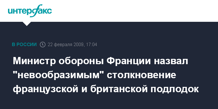 Абу-Даби. 22 февраля. INTERFAX.RU - Министр обороны Франции Эрве Морен назвал "невообразимым" инцидент в Атлантике, где 10 февраля столкнулись французская и британская атомные ракетные подводные лодки.