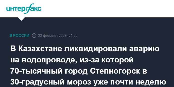 Кокшетау/Степногорск. 22 февраля. ИНТЕРФАКС-КАЗАХСТАН - Завершены аварийно-восстановительные работы на магистральном водопроводе близ Степногорска Акмолинской области Казахстана, сообщила заместитель акима города Ольга Титова.